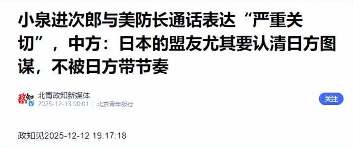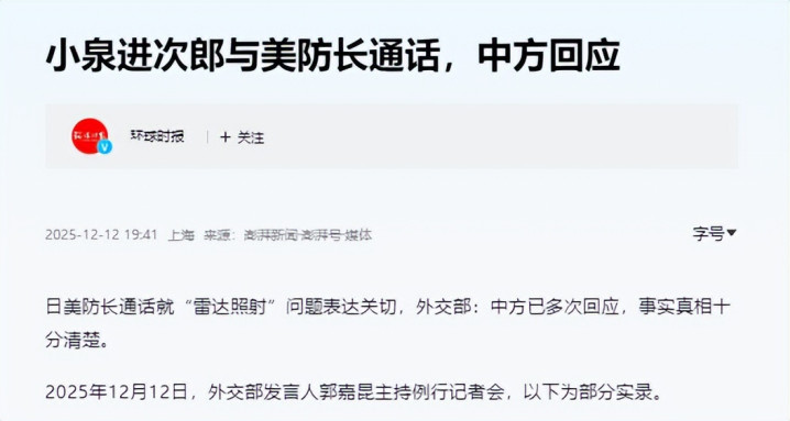 小泉把电话打到了好意思国国防部长赫格塞想的办公桌上。这不仅是一场陈述,更像是一个受了憋屈的孩子,非要趁着“家长”还没放工时告上一状,随后日方发布的通稿可谓是阵容嚣张,大篇幅渲染两边如何痛斥中国军机照耀雷达、如何对中俄纠合巡航示意“严重怜惜”。
